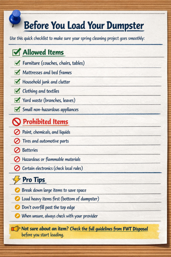 A spring cleaning dumpster rental can handle most of your household wasteâbut knowing the limits is key to a smooth and hassle-free experience. When in doubt, check first and load smart.